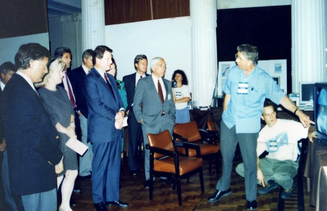 VAN SANT DEMONSTRATES THE EARTH SITUATION ROOM TO EARTH SUMMIT ATTENDEES, INCLUDING US SENATORS AL GORE, CLAIBOURNE PELL, JOHN KERRY, AND JOHN CHAFEE AT THE RIO CENTRO CONVENTION CENTER, BRAZIL, C. 1992
