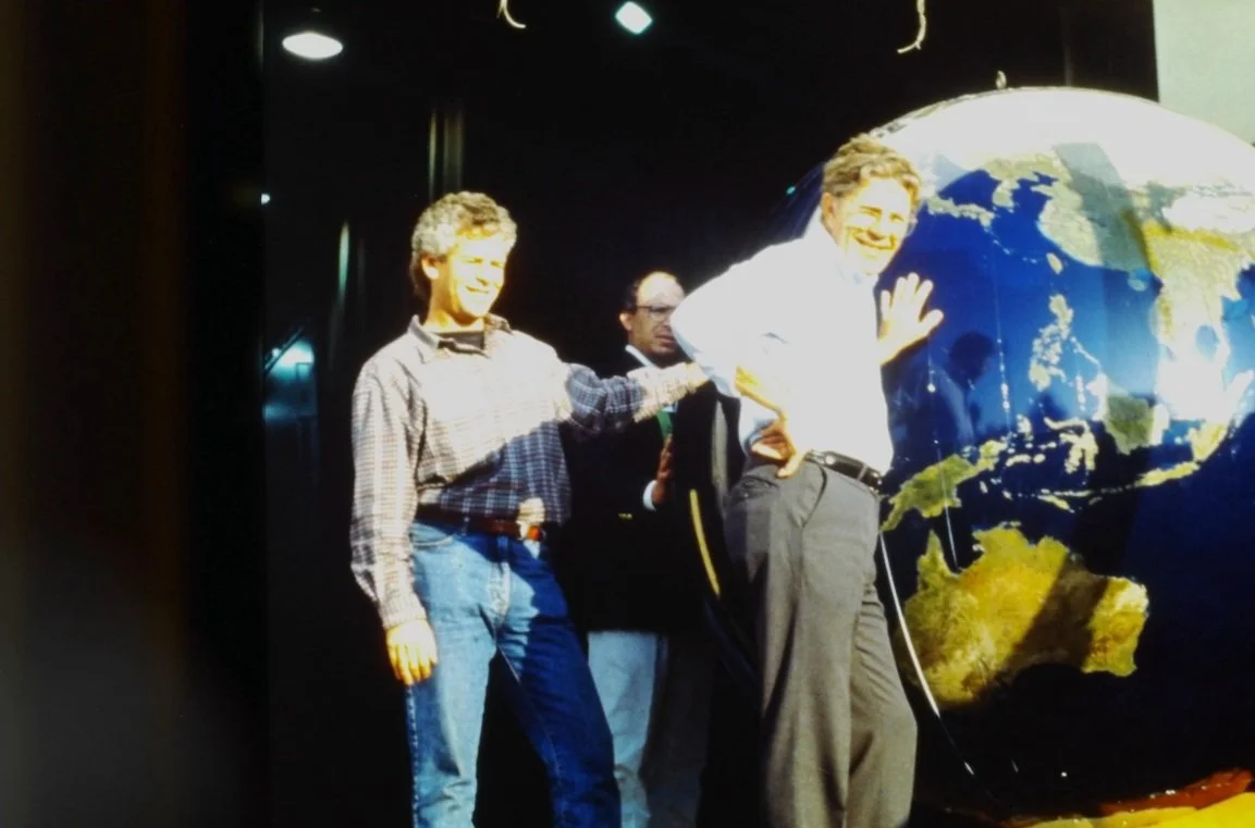 VAN SANT AND FRIENDS WITH THE FIRST COMPLETED LARGE-SCALE GEOSPHERE GLOBE, C. 1991